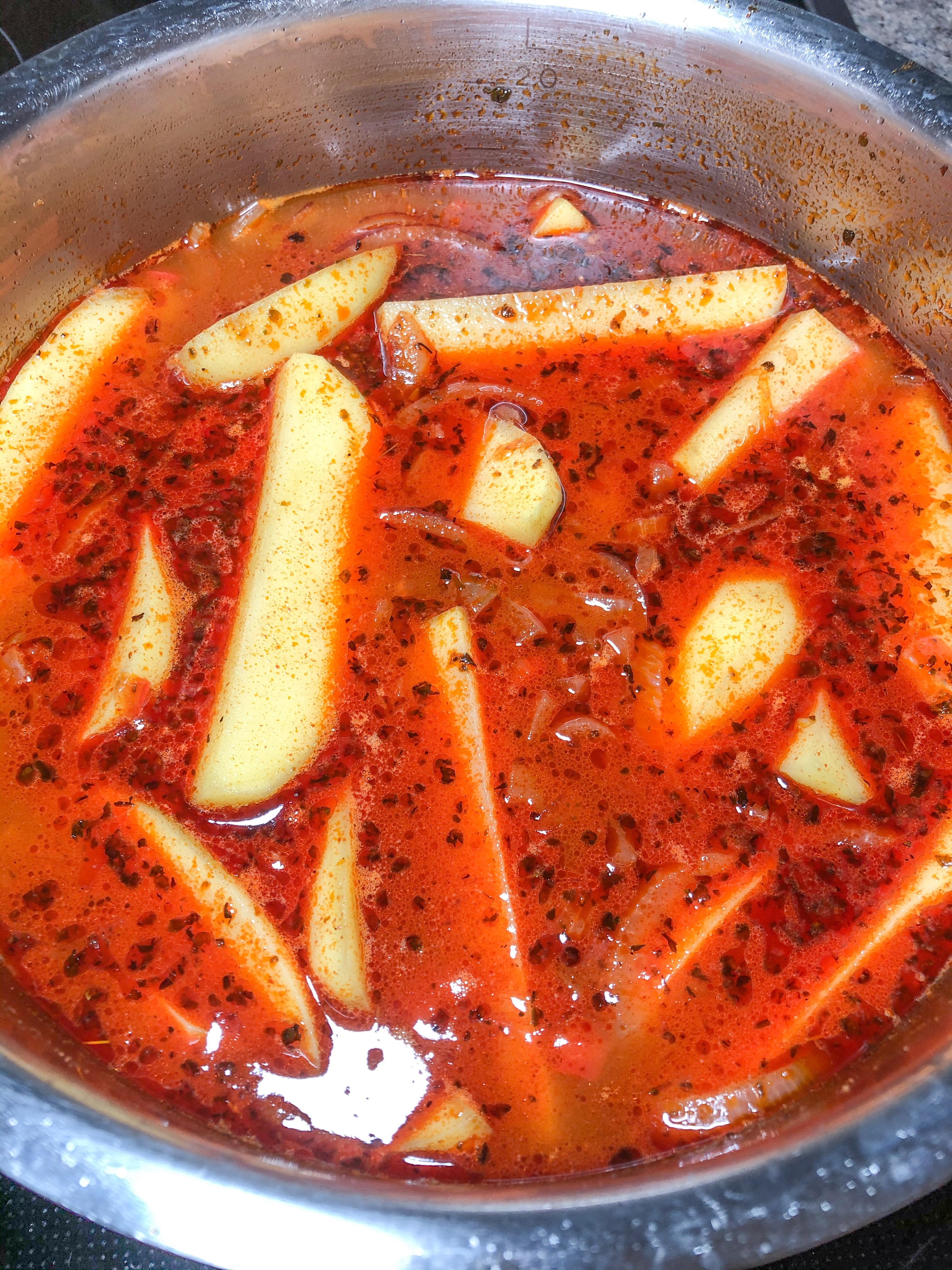 - Beides in das Gulasch geben und alles nochmal 10 Minuten ziehen lassen. Nicht zu wild umrühren, die Erdäpfel sollen nicht zerfallen.